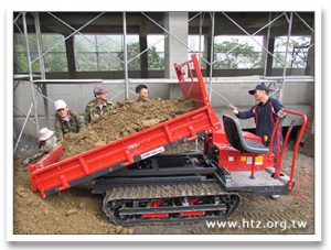 上工吧!今天的主要工作是填土,讲师会用“怪手”(挖土机)将土挖起来,再用运输车小红将土运过来,我们再将土用接力的方式递送至低漥处填平。