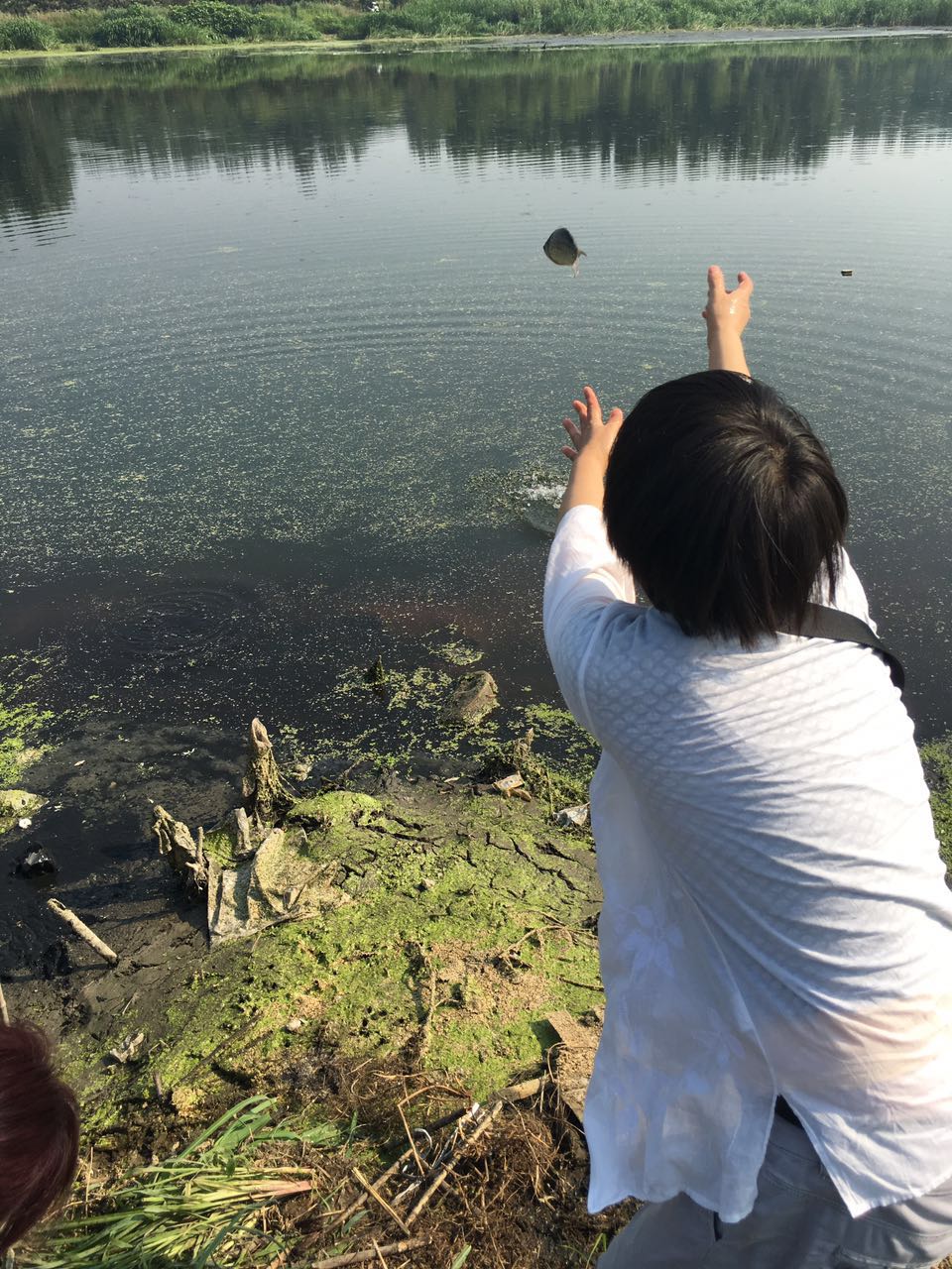这时,捞水草的工人看到了,冲着我说:“你那样抛,鱼都得脑震荡了。别人来放生,动作都很轻,怕伤到鱼。”我不禁心头一震。工人的话提醒到了关键点——对生命的敬意,我立刻好惭愧。原本自己还担心他们来干扰或是去捞鱼,反倒自己是小人心了。
