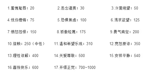 他把人的情绪映像到1-1000(100 Hz~100000 Hz)的范围。他发现任何导致人的振动频率低于200(20,000Hz)的状态都会削弱身体,而从200到1000的频率则使身体增强。霍金斯发现,诚实、同情和理解的意念,会改变身体中粒子的振动频率,进而改善身心健康。邪念会导致最低的频率,当你想着下流的邪念,你就在削弱自己的健康。经过精密的统计分析之后,他研究的结果让人大开眼界,现摘录其主要项目如下: